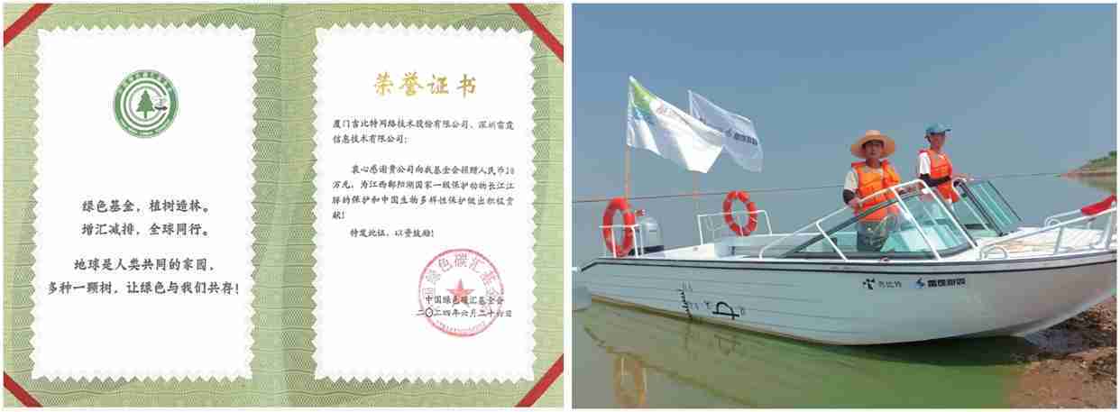 2024年6月,,,公司携手中国绿色碳汇基金会,,,,开展“保卫江豚”公益活动,,向基金会捐赠人民币20万元用于采购全新巡逻艇,,,,以支持鄱阳湖长江江豚保护工作。。截至2024年底,,,,公司捐赠的资金与巡逻艇已经有效协助巡护队对鄱阳湖1,667头江豚开展保护行动。。