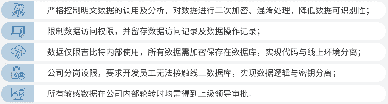 公司对用户个人信息实施脱敏处理,,,,严格限制用户信息用途,,,数据使用完成后集中归档处理。。。为进一步确保数据处理过程的安全,,公司根据实际的业务工作分岗设限,,,,最大程度保护数据隐私安全,,如在生产网络中的加密数据由研发部门员工负责编写加、、、、解密程序,,,但其无法直接访问到加密后的数据库;程序的加、、、解密密钥由运维员工单独配置。。。。