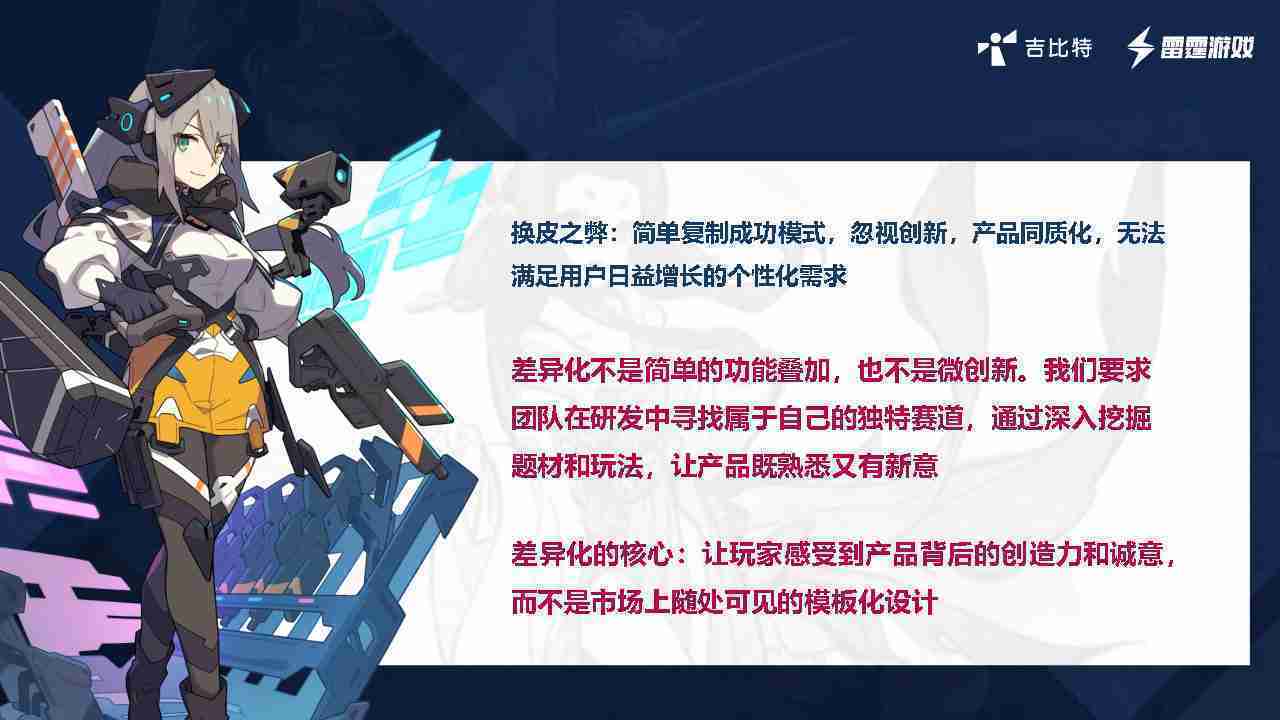 在我们内部是这么定义差异化的。。。首先,,差异化不是简单的功能叠加,,更不是换皮。。只是换皮,,,产品无法提供有效的市场价值。。。内部经常说差异化的产品不是为了迎合市场,,而是找到一个自己独特的表达方式,,在研发中找到属于自己的细分赛道和独特赛道,,,前提是需要对这个题材有足够的深入、、、、挖掘,,,对玩法有足够深入的理解,,,,让产品看起来既熟悉又有新意。。。