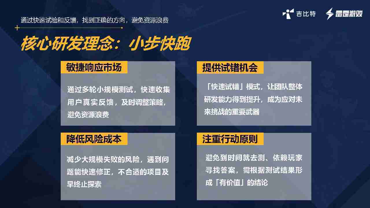 小步快跑不是找答案,,,,而是验证答案。。。。我们之前有项目是这样的,,有些制作人会有几个方向觉得都可以做,,,,但是不确定做哪一个,,,,会选择几个都做,,,,做完拿到市场跑,,,跑出哪一个更好,,,基于这个再做后续的研发和拓展。。。但这种情况最容易出现一个问题,,,,可能被玩家裹胁,,,玩家说这个点不错、、、那个点不错,,到底听还是不听,,,不听感觉是无视玩家的反馈,,,听的话,,可能自己没想清楚导致研发思路发生偏颇。。。。所以针对这一点后面自己复盘整理,,,发现制作人自己心里要有数,,要做自己觉得好玩的,,,而且明确知道这个东西是你想做的,,,然后拿到市场验证这个答案是不是对的,,,而不是拿一堆答案找哪一个答案更好。。。
