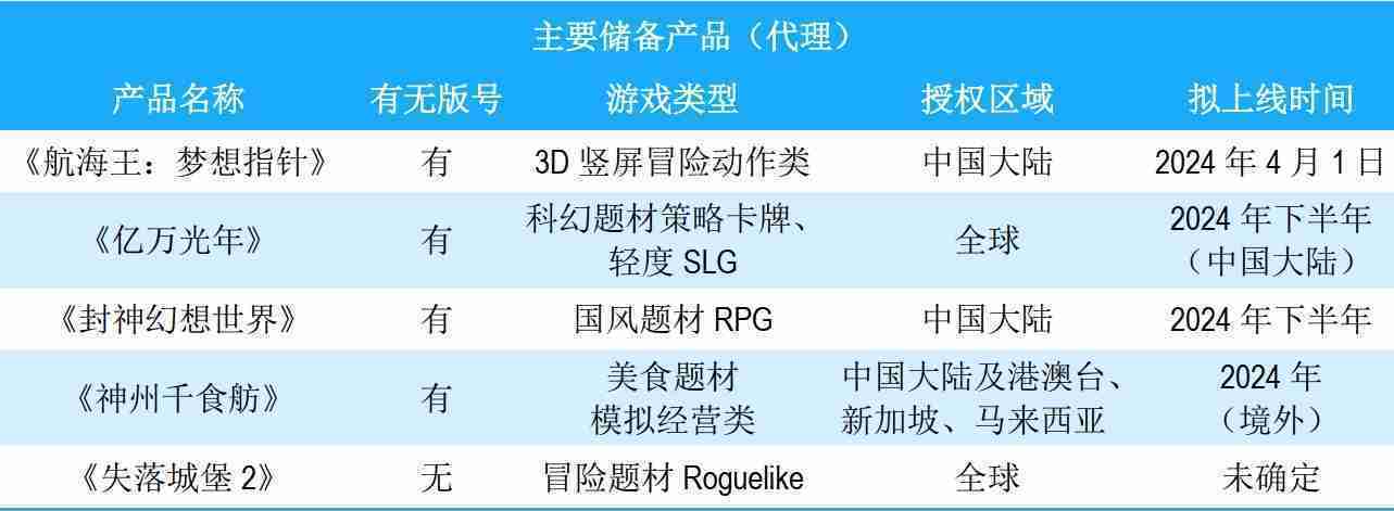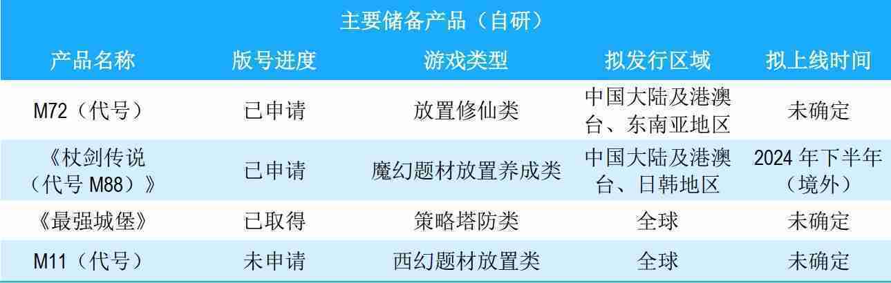 公司储备的多个自研、、、代理产品都在有序推进当中,,,,涵盖放置类、、策略类、、、、模拟经营类、、、、RPG、、、、Roguelike等多元化游戏品类,,,,储备的主要自研和代理产品如下::